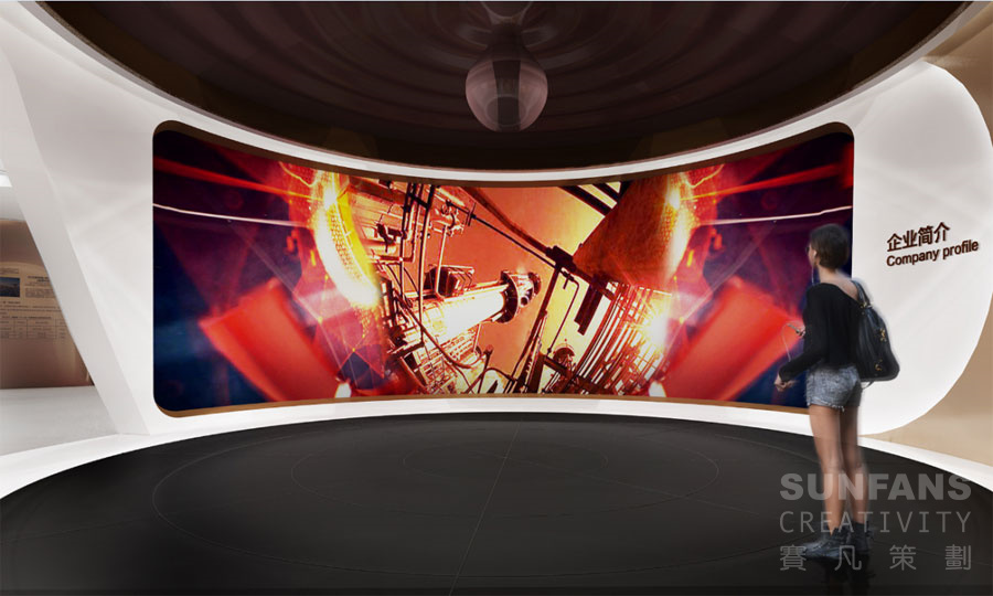 我們以石油油滴為意向的中心雕塑造型,凸顯著行業(yè)屬性,配合大型弧幕共同組成智慧之光虛擬劇院,地面鋪設(shè)深色地膠,通過燈光的漸變效果圖,結(jié)合地膠切割線模擬漣漪效果。煉化基地、智慧工廠等主題影片展現(xiàn)企業(yè)作為世界一流的工程公司的大發(fā)展、大格局、大氣魄。