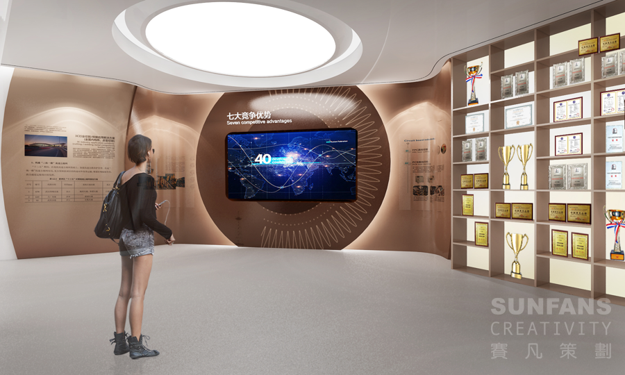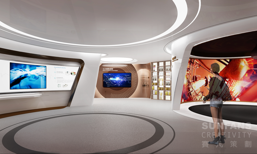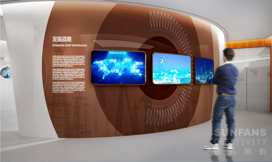 通過選取油滴滴落產(chǎn)生的漣漪為設(shè)計元素,配合同色系漸變的色彩設(shè)計,使展示內(nèi)容隨著水紋一層層展開,同時加入多點觸控屏,主要展現(xiàn)公司核心業(yè)務(wù)、競爭優(yōu)勢、數(shù)字化展示平臺等。