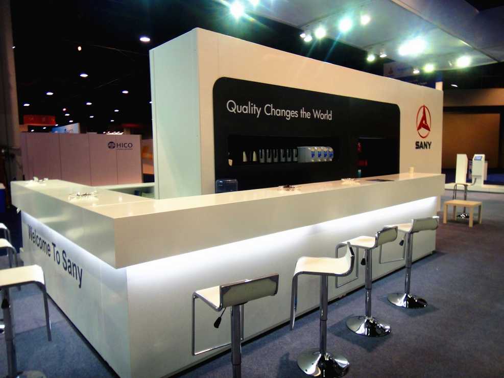 在本案中,賽凡使用了偏暖白的顏色進(jìn)行主體設(shè)計(jì),地面鋪設(shè)灰色地毯,暖白與灰色的結(jié)合是一冷一暖的融合,色彩的碰撞激發(fā)出更加具有藝術(shù)的氛圍。整個(gè)設(shè)計(jì)與國際接軌,獨(dú)棟的二層獨(dú)立展示臺與樓宇無異,可以讓人更容易注意到SANY的展臺。在展臺外側(cè),放置現(xiàn)代化的沙發(fā)型座椅,方形的的小型洽談桌讓整體風(fēng)格更加偏北美風(fēng)格,融入其中。在獨(dú)立的樓層兩側(cè)與正面,賽凡都將品牌的LOGO進(jìn)行展示。一層為三個(gè)獨(dú)立的私密會議室,方便客戶進(jìn)行更進(jìn)一步的商務(wù)洽談。通往二層的樓梯采用鐵藝,彰顯出外放的企業(yè)特點(diǎn)。