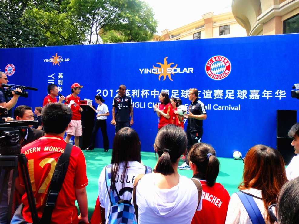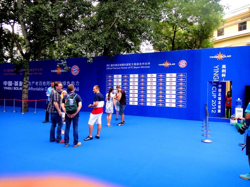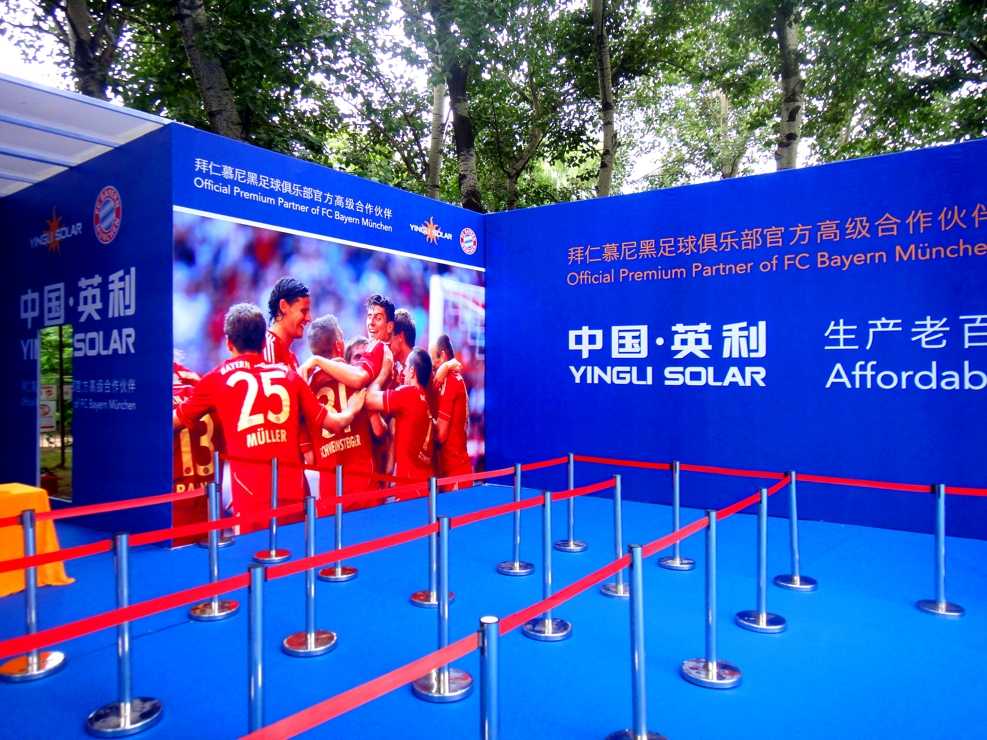 在北京,拜仁除了進(jìn)行友誼賽等足球活動(dòng),還參加了中國·英利的杯足球友誼賽足球嘉年華活動(dòng)。在本場(chǎng)地的布置上,選用了大面積的藍(lán)色地毯進(jìn)行鋪設(shè),四周使用相同顏色的藍(lán)色擋板用于背景板的使用。主舞臺(tái)采用了淺綠色的色調(diào),藍(lán)色與綠色的結(jié)合,象征著足球積極向上的拼搏精神,競(jìng)技精神。綠色也讓到訪的球員更有親切感,更好的融入中國。