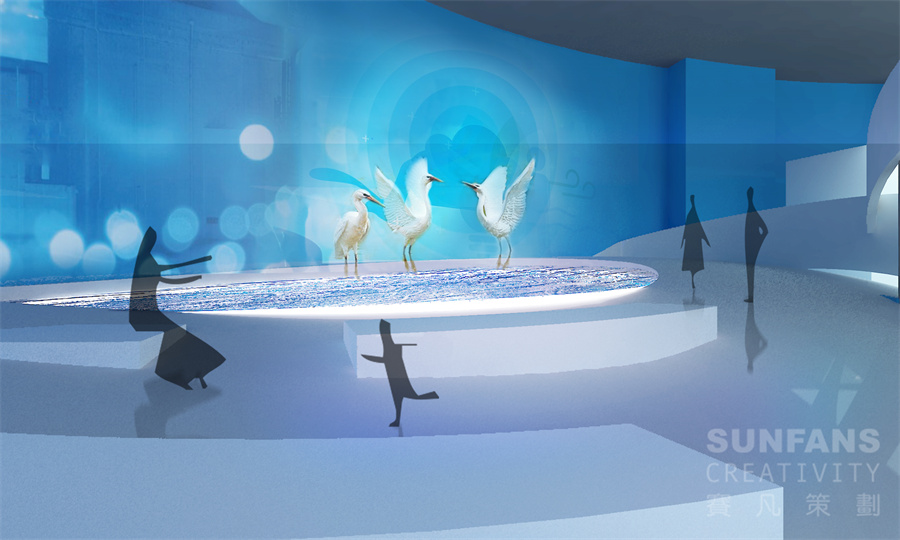 我們借地域特色,將海洋文化引入到展陳設(shè)計中,以海洋的深藍(lán)色調(diào)為底色,以此包蘊(yùn)人類持續(xù)開拓探索的勇氣;以核能為點(diǎn)睛,指向人類善用自然能量的智慧,兩者共同構(gòu)建起融合科技與藝術(shù)的展陳空間。