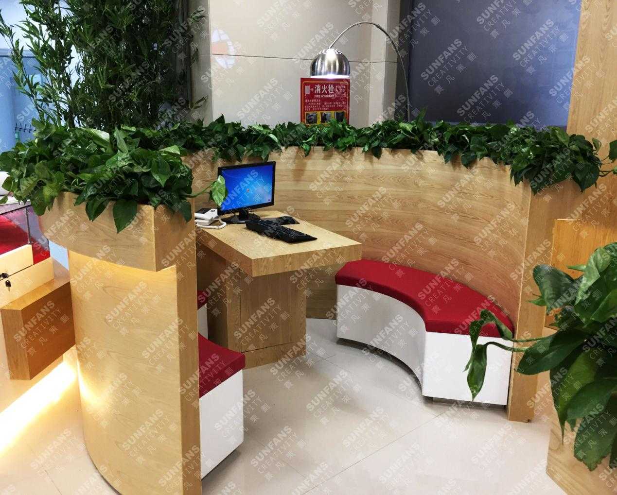 銀行的展廳運(yùn)用了大量的綠色植物,尤其理財區(qū)域的設(shè)計半封閉的空間式設(shè)計,在注重隱私的同時,也拉近了與顧客之間的距離,增添輕松地氛圍。