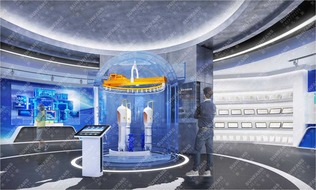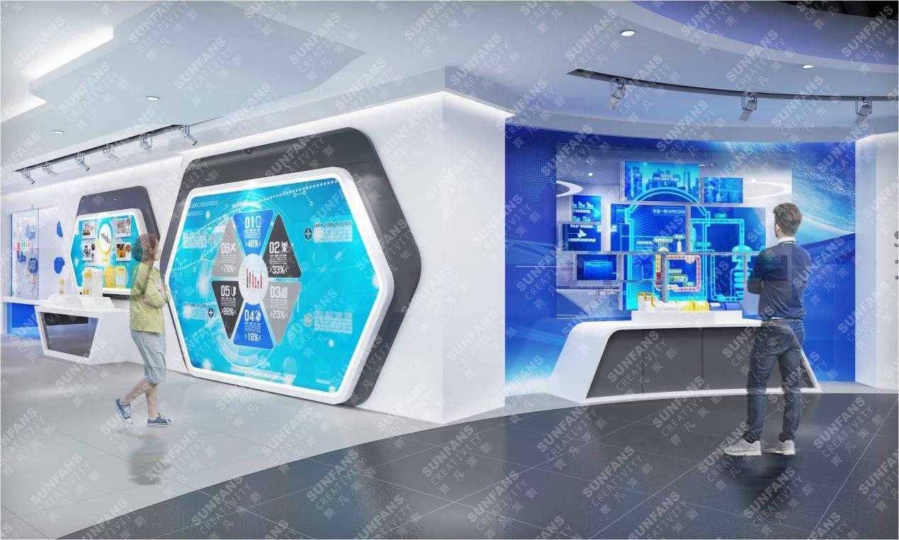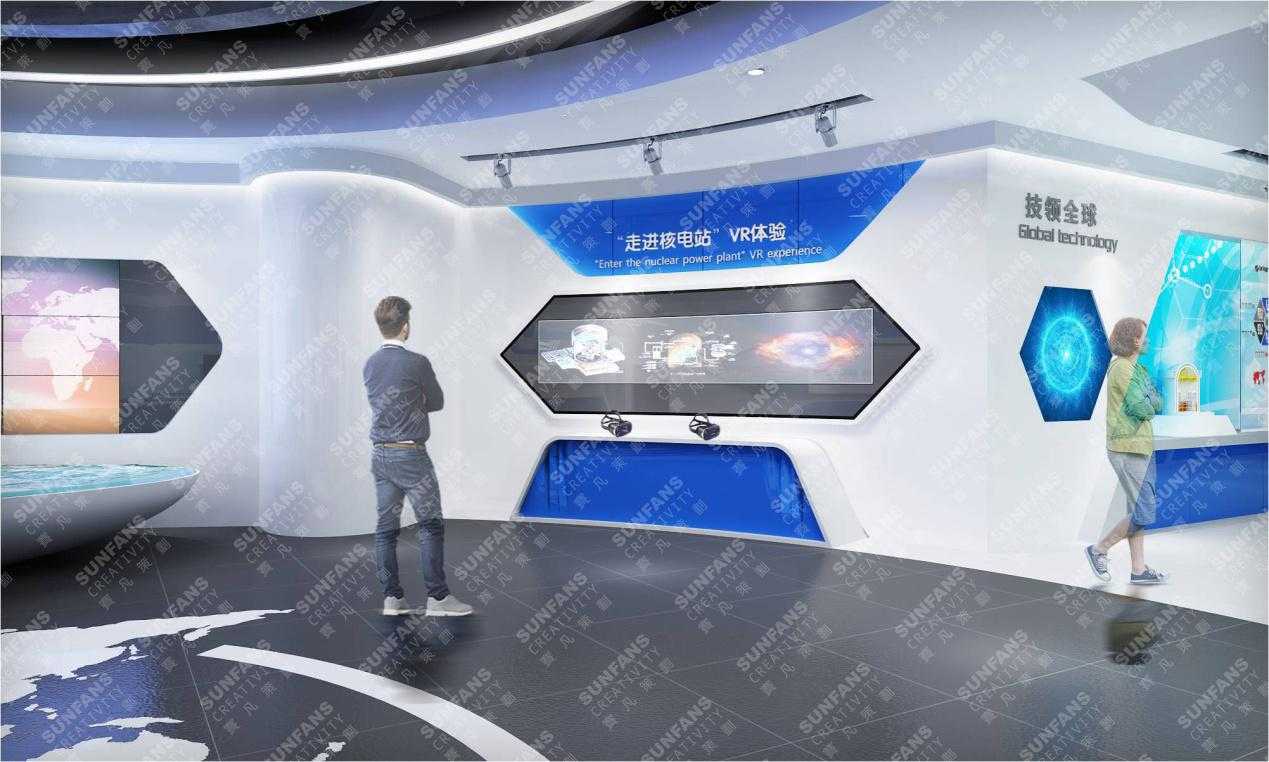在空間色彩風(fēng)格設(shè)計(jì)上,以藍(lán)、白主調(diào)形成國(guó)際化、科技感的簡(jiǎn)約格調(diào),通過運(yùn)用提煉安全核等元素,利用折形的墻面造型營(yíng)造工業(yè)感,打造中核建專屬展廳,植入更為先進(jìn)的展示手段,以精致的品質(zhì)感,融入VR互動(dòng),三位一體沙盤等科技展項(xiàng)。
