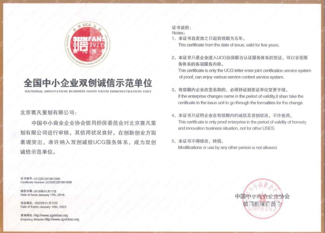 賽凡獲得全國(guó)中小企業(yè)雙創(chuàng)誠(chéng)信示范單位