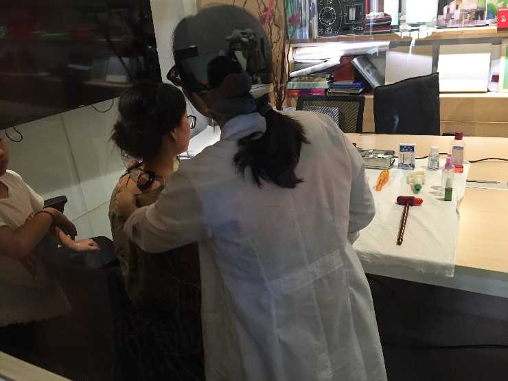 丁大夫?yàn)槲覀兊娜耸陆?jīng)理進(jìn)行“放血拔罐”,目的是緩解她頸椎的疼痛問題