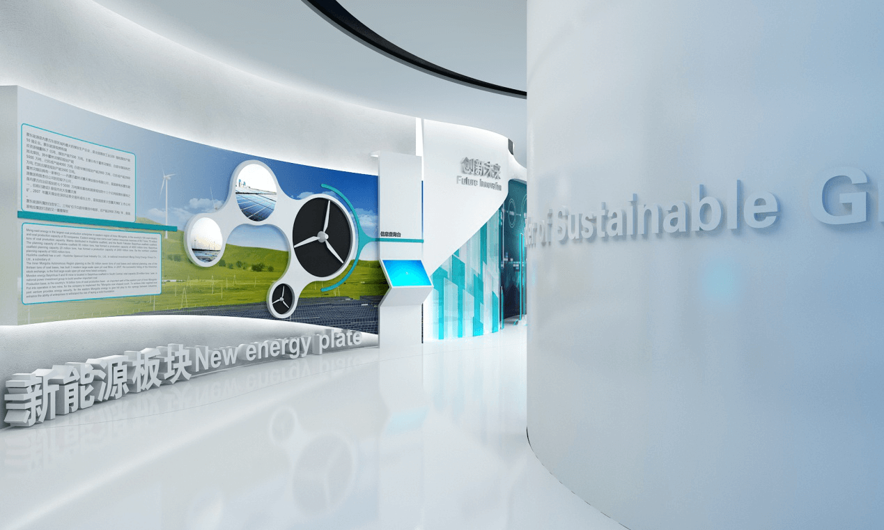 展館以“用智慧鏈通能源” 為題,突出經(jīng)濟(jì)循環(huán)一體化的概念,布局結(jié)構(gòu)中運用循環(huán)、整體的概念,空間開闊、流暢,跟隨參觀,企業(yè)特性自然呈現(xiàn)。