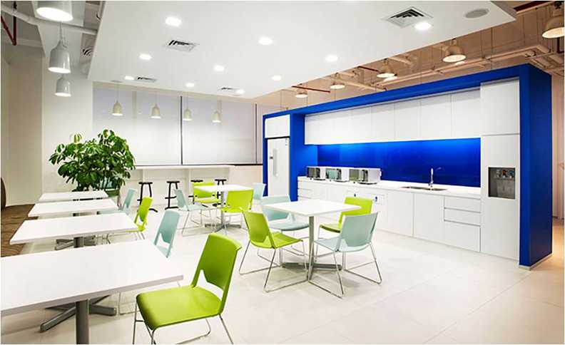 明亮的休息室整體以白色與藍(lán)色為主,為員工打造一種安靜、舒服的休息環(huán)境?,F(xiàn)代化的桌椅與墻體的顏色保持一致,這都可以讓員工可以產(chǎn)生愉快的心情。明快的色調(diào)也起到了增添室內(nèi)采光的效果,達(dá)到更好的生機(jī)的視覺(jué)效果。