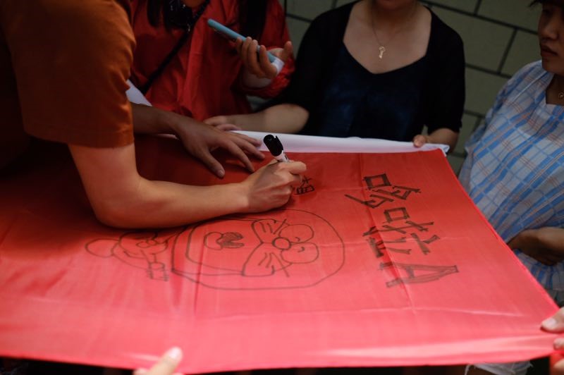 在之后,我們分了兩組,教練給了我10分鐘的時(shí)間,讓我們?cè)诩t藍(lán)兩旗上設(shè)計(jì)自己隊(duì)伍的logo,隊(duì)名以及口號(hào),并簽上隊(duì)員的姓名,還設(shè)計(jì)了ending pose。最終哆啦A隊(duì)以及花兒與少年隊(duì)伴隨我們這一天。