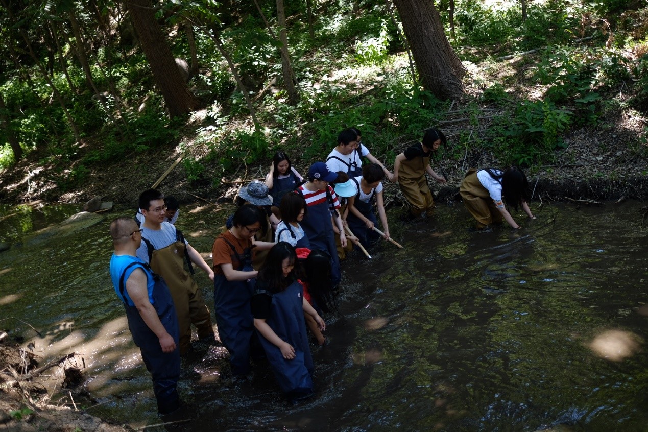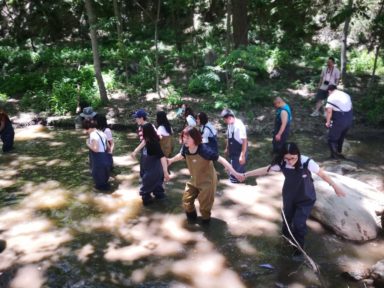 今天的團(tuán)建的第一個(gè)項(xiàng)目是渾水摸魚,教練指導(dǎo)了我們注意事項(xiàng),帶我們走到森林深處的水塘處,穿戴整齊完畢,兩隊(duì)一起PK進(jìn)行捕魚工作。