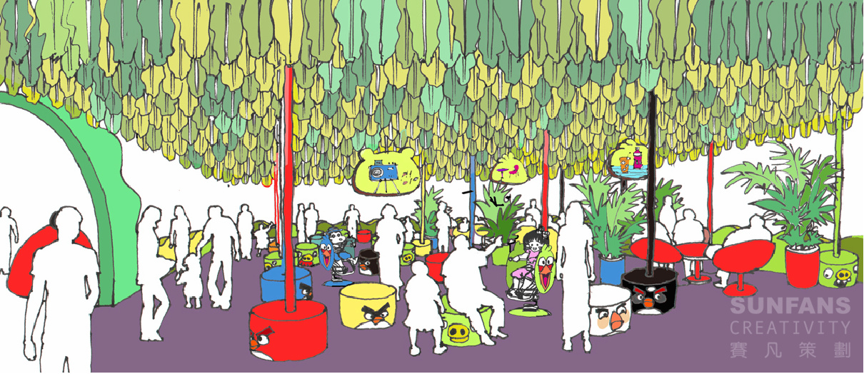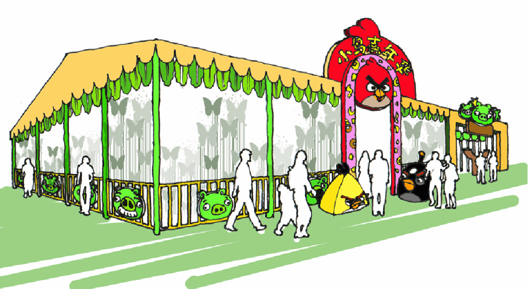 迎賓廣場(chǎng)設(shè)計(jì)兩側(cè)分別為小鳥(niǎo)團(tuán)隊(duì)及綠豬團(tuán)隊(duì)的游戲立體形象歡迎小朋友的到來(lái),在活躍整場(chǎng)氛圍的同時(shí)也是拍照留念的場(chǎng)所。