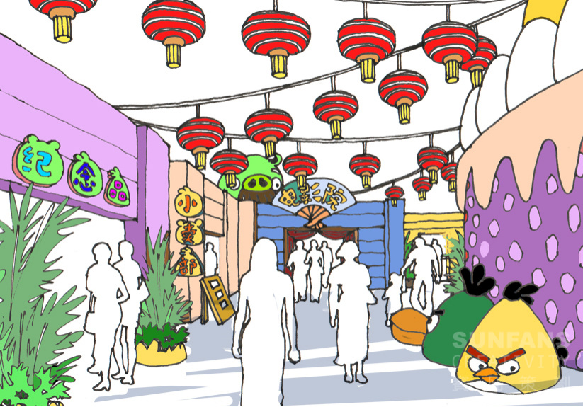結(jié)合了小鳥(niǎo)形象裝飾的商業(yè)街空間仿佛把小朋友們帶入了游戲世界,功能齊全的配套服務(wù)為進(jìn)入樂(lè)園的大人小孩提供了便利的購(gòu)物服務(wù)。